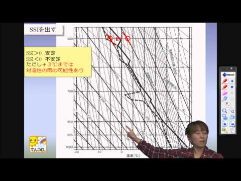 横軸は温度等温線であり、線形です。元のエマグラムの場合、この軸は圧力の軸に対して垂直です。乾燥断熱減圧を表す線は等圧線の左側ほぼ 45 度にあります。混合比等値線はほぼ直線で垂直であり、飽和擬似断熱線は垂直よりわずかに左側に傾いた直線です。